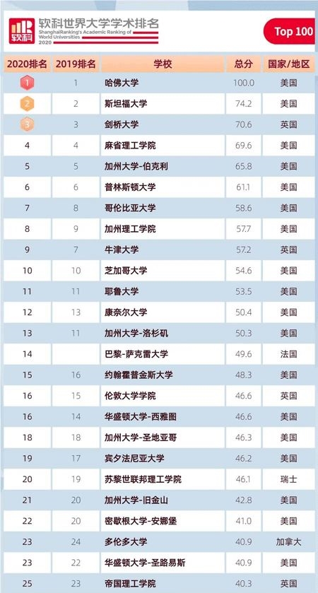 斯坦福大学仅次于哈佛大学,继续保持全球第二名,剑桥大学保持全球第三。哥伦比亚大学和加州理工学院排名均上升1位,依次位列全球第七和第八。