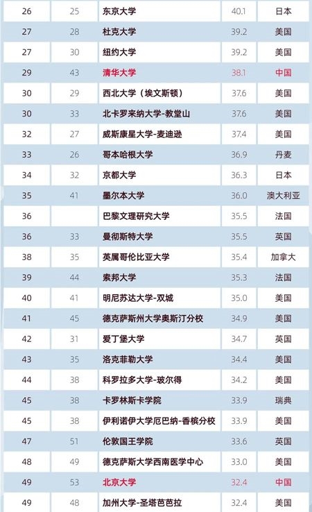 亚太地区的大学中,日本的东京大学表现最佳,位列第26名,清华大学(第29名)首次超过京都大学(第34名),赢得亚太地区亚军席位。