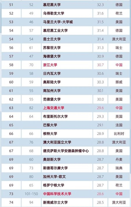 在欧洲大陆的大学中,排名最高的是法国的巴黎萨克雷大学,首次上榜便高居全球第14名。同样入选法国“卓越大学计划”(IDEX)的巴黎文理研究大学和巴黎大学分别位居第36名和第65名。