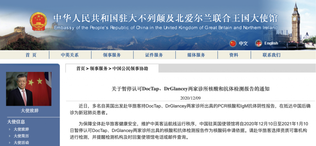 据大使馆官网通知,自2020年12月10日至2021年1月10日期间,将暂停认可DocTap和DrGlancey两家诊所出具的核酸和抗体检测报告作为核酸码申请依据。
